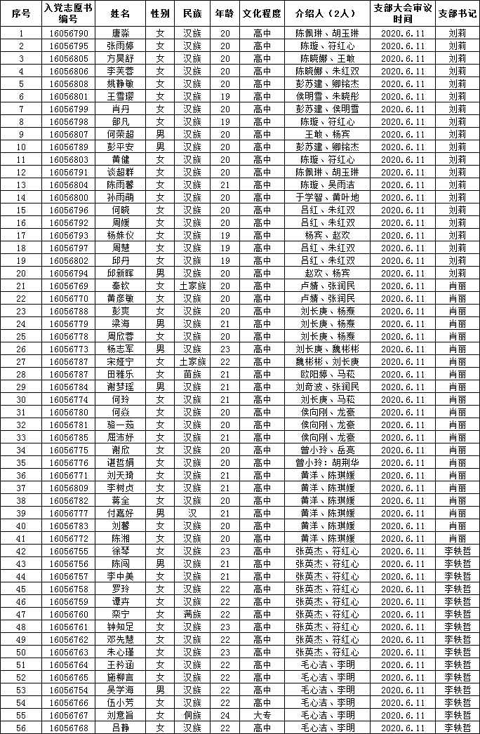 我院第一、四、五学生党支部于2020年6月11日召开了支部大会,讨论接收以下56位同学发展为预备党员,根据要求,现予以公示,公示期为2020年6月12日至18日,如有异议请分别向各学生党支部反馈。