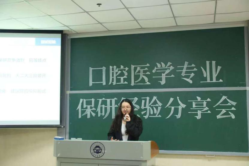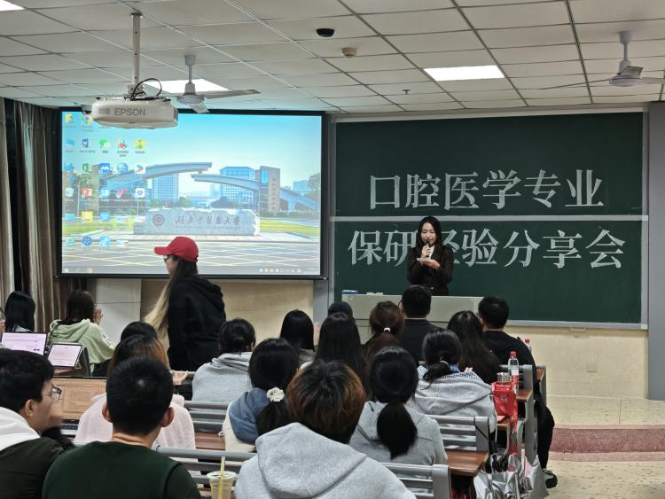 为精准助力口腔医学专业学子明晰深造路径、汲取宝贵经验,2025年10月30日晚七点,21级口腔医学专业保研经验分享会于济世楼209教室顺利举行。本次分享会由2024级口腔医学4班黄熙然同学主持。活动特邀21级已成功保研的彭瑞璇、杨盼、邓芳萍、周念念四位优秀学子担任主讲。他们结合自身经历,分别从目标定位、院校选择、材料准备、面试技巧及心路历程等不同维度,倾情分享了各自的成功经验与独到见解,为在场同学带来了一场内容翔实、干货满满的经验盛宴。医学院学生科副科长李轶哲老师、21级口腔医学专业辅导员赵宇玺老师、22级与24级口腔医学专业辅导员邹翔老师亦莅临现场,密切关注同学们的学业发展,并就保研规划与策略提供了宝贵的专业指导。