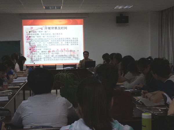 在讲座中,祁老师首先对支部前一阶段的党建工作进行了总结,对后一阶段教育活动进行了布置。随后,祁老师从以下几方面对“两学一做”学习教育进行了系统阐述:一是开展“两学一做”学习教育,是面向全体党员深化党内教育的重要实践,是推动党内教育从“关键少数”向广大党员扩展、从集中性教育向经常性教育延伸的重要举措;二是开展“两学一做”的目的、开展时间、着力解决的问题;三是“两学一做”带着问题学、针对问题改的总体要求;四是“两学一做的主要内容;五是“两学一做”的主要措施。最后,祁老师引导全体党员对本学期如何开展好“两学一做工作进行了讨论。在讨论中全体党员纷纷表示会带着问题来学,把解决问题贯穿学习教育全过程,在日常生活中自觉尊崇党章、遵守党规,自觉用习近平总书记系列重要讲话精神武装头脑、指导实践、推动学习,做四讲四有合格党员。
