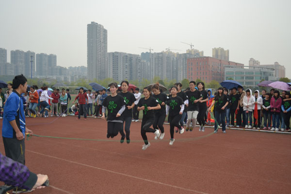 活动分为跳大绳和绑腿接力跑两部分。跳绳环节,大家井然有序,在整齐的口号声中不断跃起。绑腿接力跑中,大家手拉手齐心协力,跌倒了继续站起来往前冲。虽然活动时下着小雨,但是完全没有影响大家参加活动的热情,在比赛中各班同学积极参与,竭尽全力,通过这个活动,同学们不仅提高了身体素质,还增强了班级凝聚力。最终11级影像二班以总分271分获得第一名。
