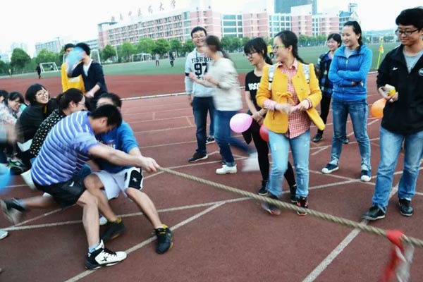 短暂的集合后,主持人按序将全体人员分为四组开展游戏活动。首先,“衔杯传水”游戏让大家迅速活跃起来。紧接着,团队比赛正式开始。“背夹气球”使组员们愈加亲密;“拔河”考验了参赛队员们的体力和团队协作能力。最后,主持人进行总结,老师和同学们合影留念,此次团训圆满结束。