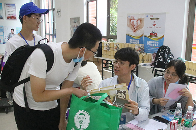 上午6时,志愿者们在8号学生公寓大厅集合,由各组组长检查完本组物资后,立即前往预定的工作地点,开始准备迎新工作。即使任务繁重,各组组员依旧积极应对,为新生提供全面周到的服务,保证高效有序地进行医学院迎新工作。在新生辅导员助理和志愿者的帮助下,新生们找到了自己对应的班级,进行新生第一轮报到注册,审查报到新生身份后,由志愿者们引导至8号学生公寓大厅。一路上,志愿者们会帮忙搬运行李,同时还会解答新生疑问,并告知注意事项。到达之后,新生在大厅完成班级签到并领取医学院新生材料包,包括寝室钥匙、床上用品领取卡、校园一卡通和医学院特别给新生们准备的伴手礼等。此外,学院针对入住新生采取精准服务,在各楼层安排学生定点服务,帮忙搬运行李。为及时处理新生反馈的入住宿舍出现的问题,学院安排人员负责迎新当天简单的维修工作,并于8号学生公寓大厅保安处登记上报维修问题。