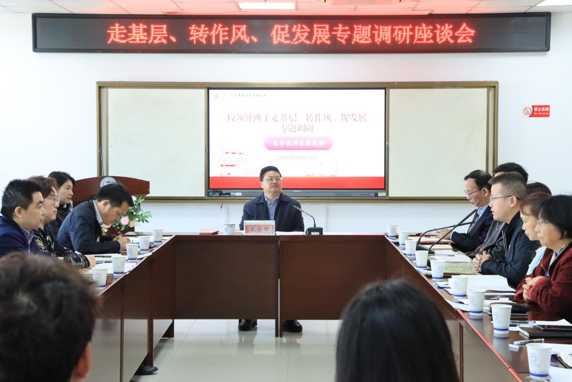 2025年10月23日上午,湖南中医药大学党委书记戴爱国带队赴医学院开展“走基层、转作风、促发展”专题调研。会议在医学院1306会议室举行,学校党政办公室、发展规划与医院管理处、组织人事部负责人及医学院全体领导班子及部分师生代表参会。