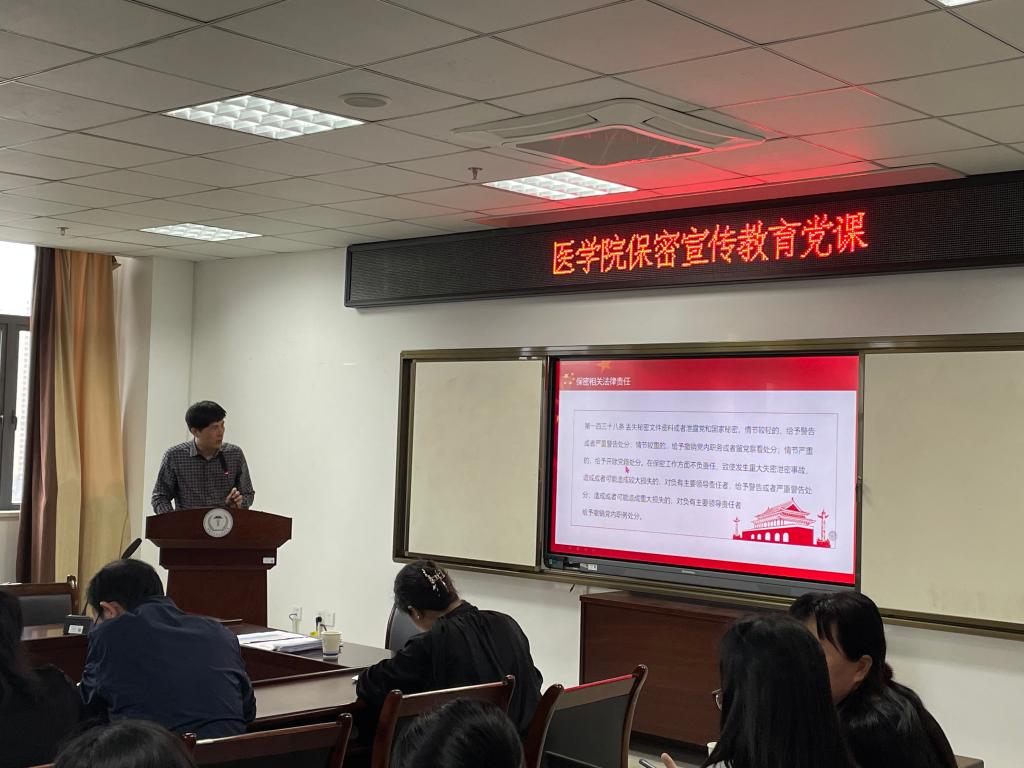 同时,为推动本月主题教育工作走深走实,文红艳书记将保密宣传教育作为近期重点工作予以强调。随后,院党委委员、副院长唐群做题为“牢固树立保密意识,筑牢保密工作防线”主题党课,宣传了新时代保守党和国家秘密的理念、意识、常识、方法技能等,并组织教师观看了保密宣传教育片《藏在照片里的秘密》,进一步增强了我院教师的保密意识、敌情观念和忧患意识。