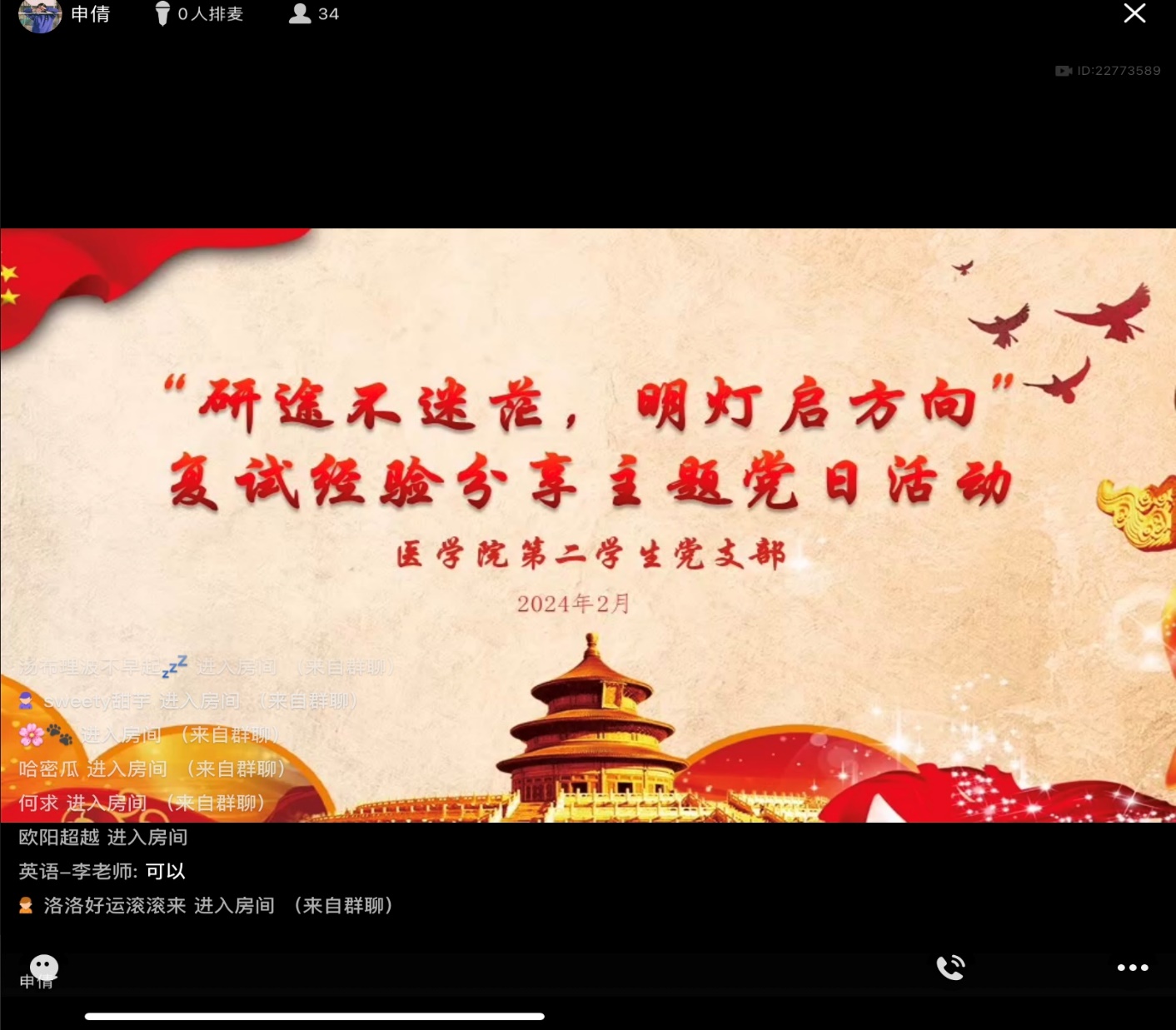 为持续推进“我为群众办实事”实践活动,用心用情帮助学生解决考研复试过程中的急难愁盼问题。医学院第二学生党支部于2月28日特举办此次“研途不迷茫,明灯启方向”复试经验分享主题党日活动。