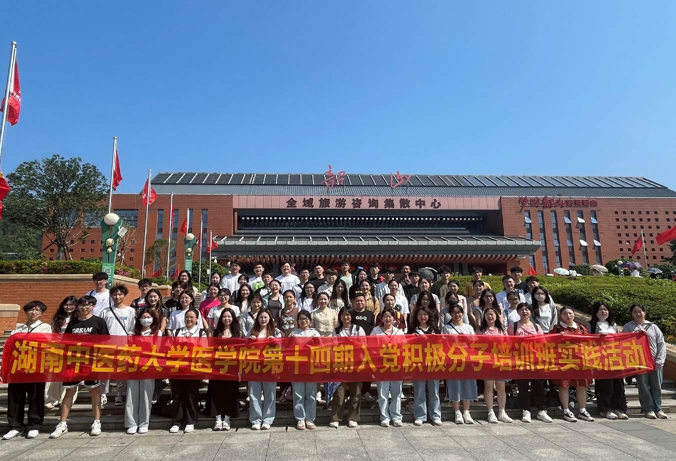为深入学习贯彻习近平新时代中国特色社会主义思想和党的二十大精神,传承红色革命基因,提高党员干部的四个自信,激发青年一代与时俱进再创新章的底气、骨气与志气。2024年5月25日,由湖南中医药大学医学院本科学生党群服务中心举办的红色实践活动在韶山景区顺利开展。医学院学生科科长丑天舒老师、医学院学生科副科长廖海燕老师、医学院学生科刘娅薇老师及医学院学生四、五支部学生党员、第十四期入党积极分子共计70人参加本次实践活动。