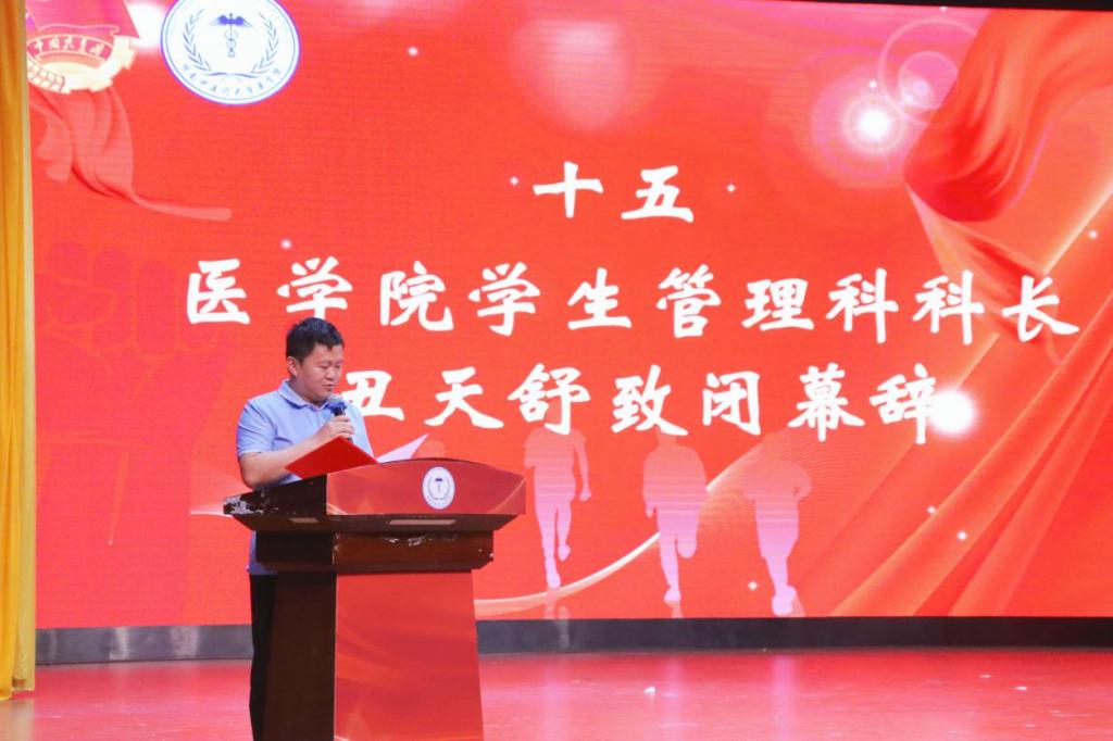 丑天舒为大会致闭幕辞。他对全体学生干部的辛勤付出表示了感谢,肯定了此次大会在总结过往、明确未来目标的重要意义,也对团员学生和新一届学生干部提出殷切期望,鼓励大家践行院训精神,提升医学素养与工作能力,为医学院建设和医学事业发展贡献力量。至此,医学院第十五次团员学生代表大会圆满落幕。